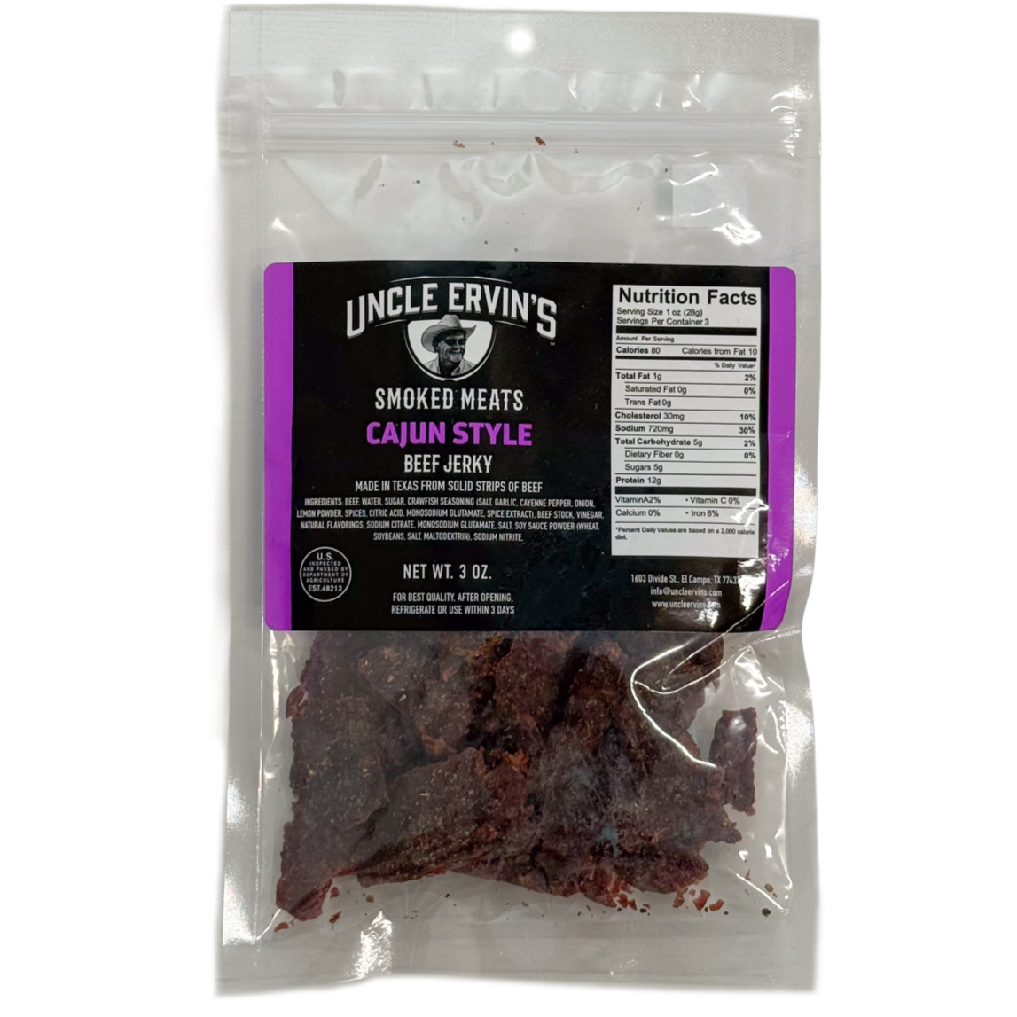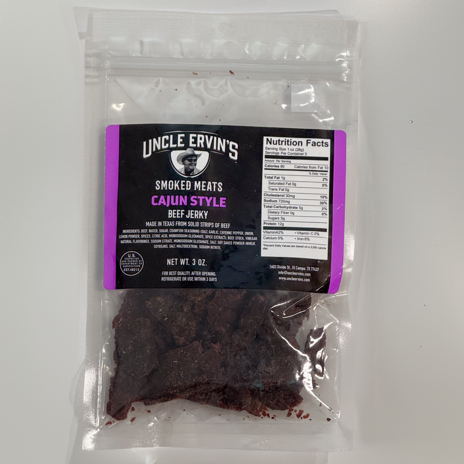 Packaged Cajun beef jerky in a clear bag with Uncle Ervin's branding